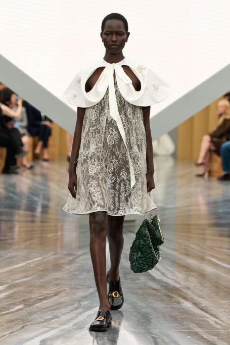 La transparence et les détails en dentelle seront de rigueur pour la saison printemps/ été 2026. Les pièces ajourées et les matières fluides pourront être complété par des vestes crop mais structuré plus chaudes avec ce détail à l'avant pour l'effet pointue de la tenue.