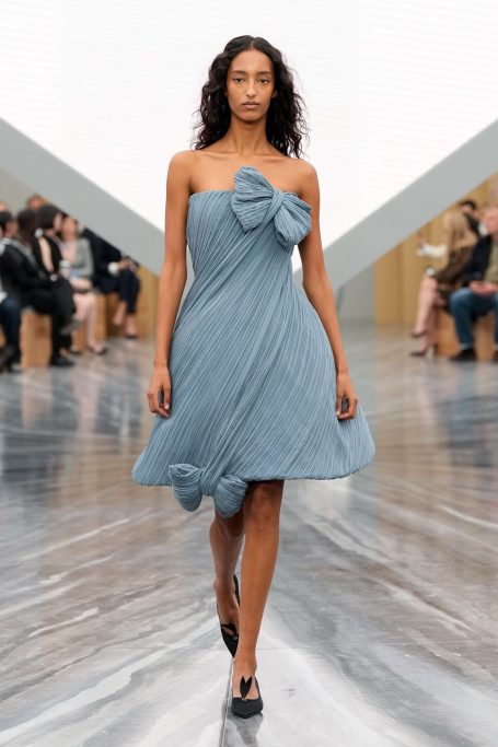Le défilé se tient au jardin des tuileries, dans une salle au décor minimaliste et pour cause, l'attention des invités de marques est dirigée sur l'écran triangulaire placé au centre de la pièce au dessus d'une boîte Dior posé au sol. Cette boîte, entre ouverte, semble ressembler à l'invivation reçu par les invités. Celle-ci ouvre les archives de la maison Dior. En préambule, un film résumant quelques vidéos des défilés d'époques ou plus actuels. Mais ces archives appartiennent à présent au passé. Car le présent s'écrit dorénavent avec l'oeil de JW Anderson. La femme Dior re découvre le plaisir de porter des robes bustiers drapées qui se déclinent en plusieurs coloris.